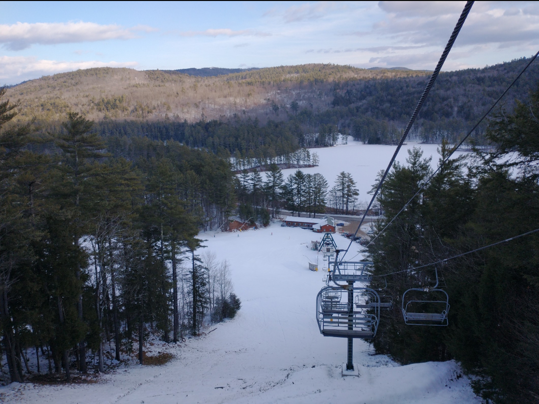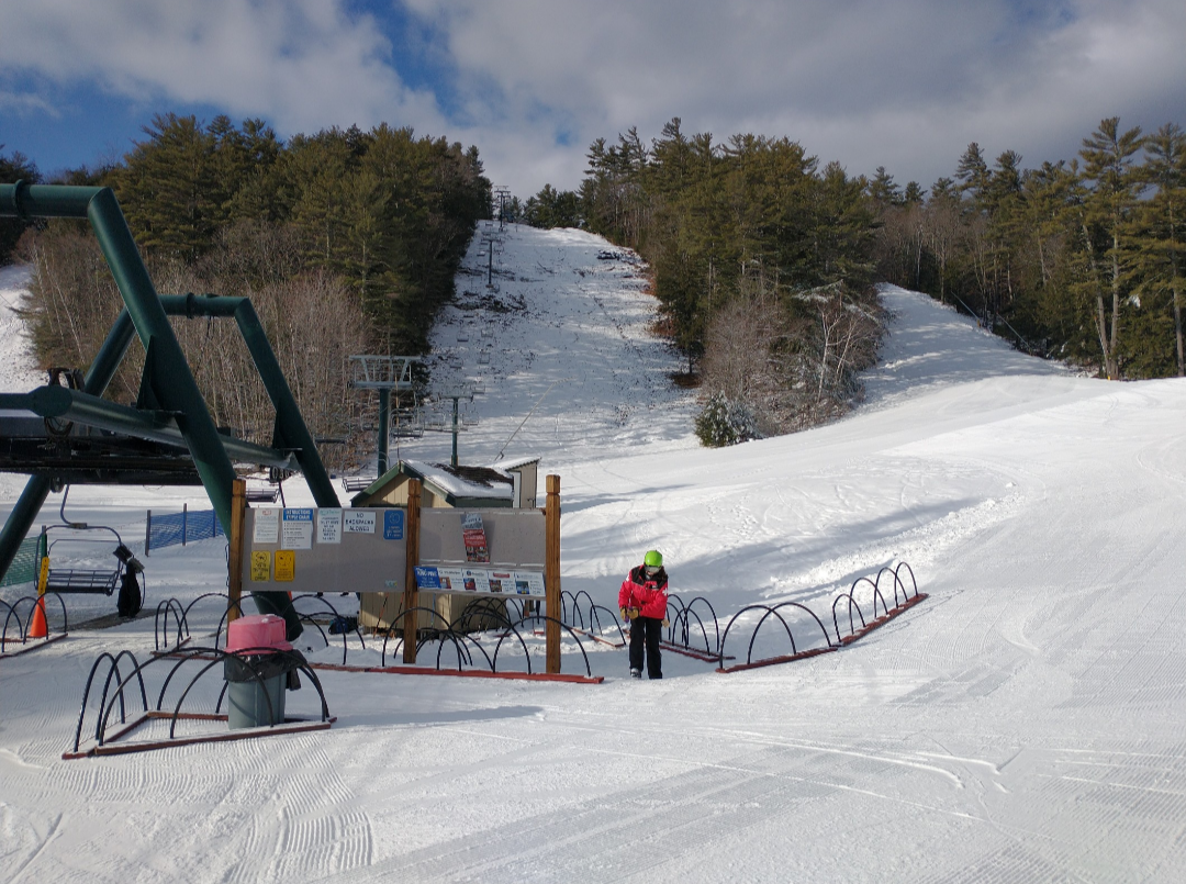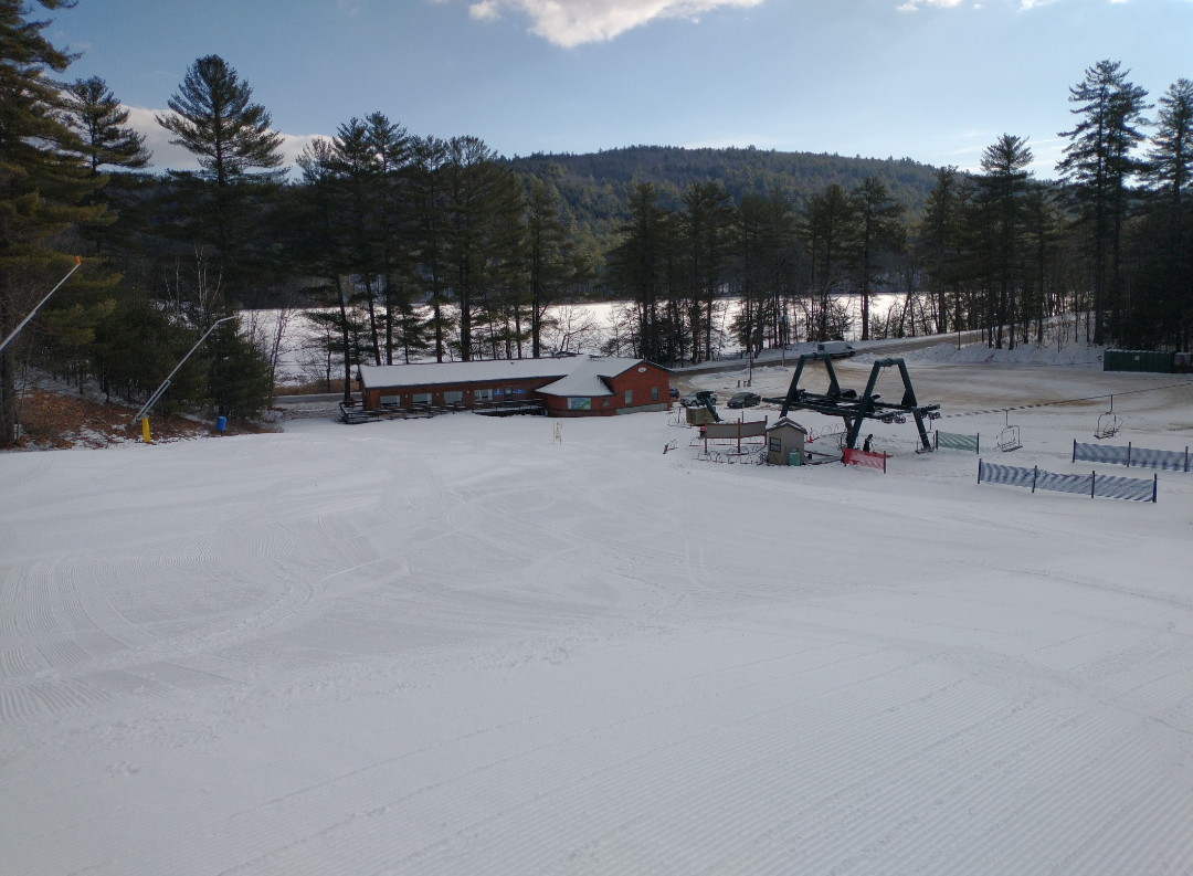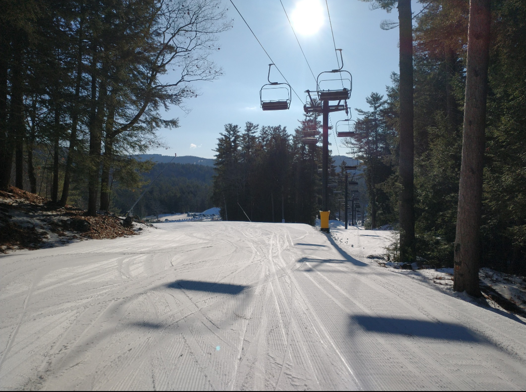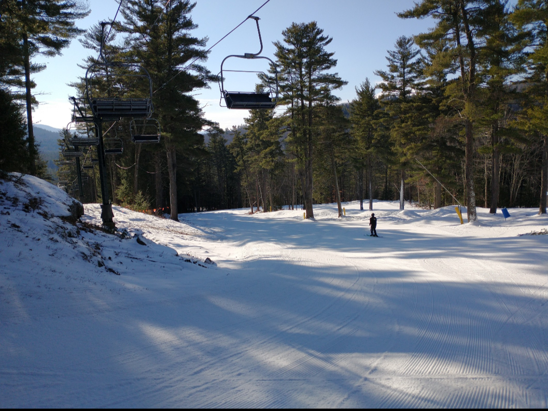 It was a beautiful bluebird day at King Pine today! It was warm and there was nicely groomed packed powder on most trails. Some trails which had recently opened, such as Jack Pine, had a more firm surface. The Polar Bear and Black Bear lifts were open with about 8 different ways down. Every trail which was not open yet had some snow made on it, and it looks like they will be set to open a lot more terrain for the weekend. Both lifts were ski-on all day, and it was just one of those perfect days where you can just keep taking lap after lap without wanting to stop.