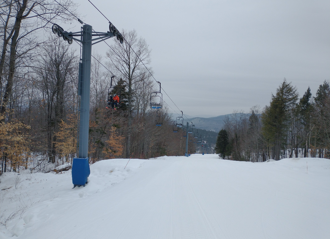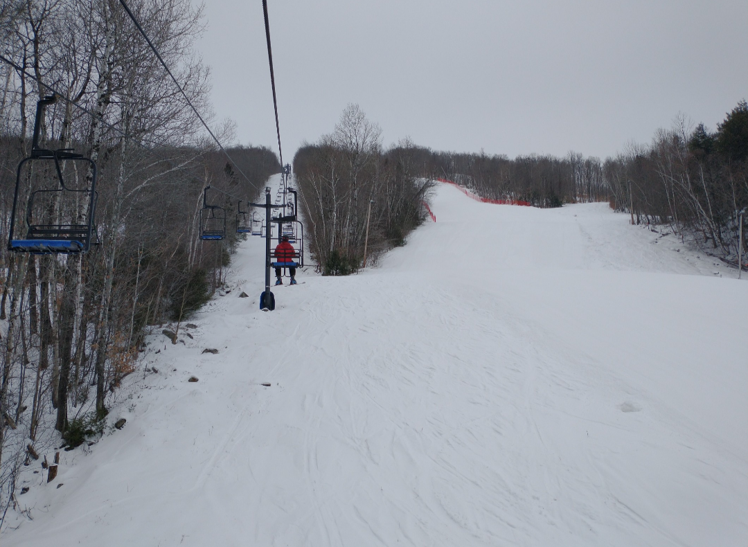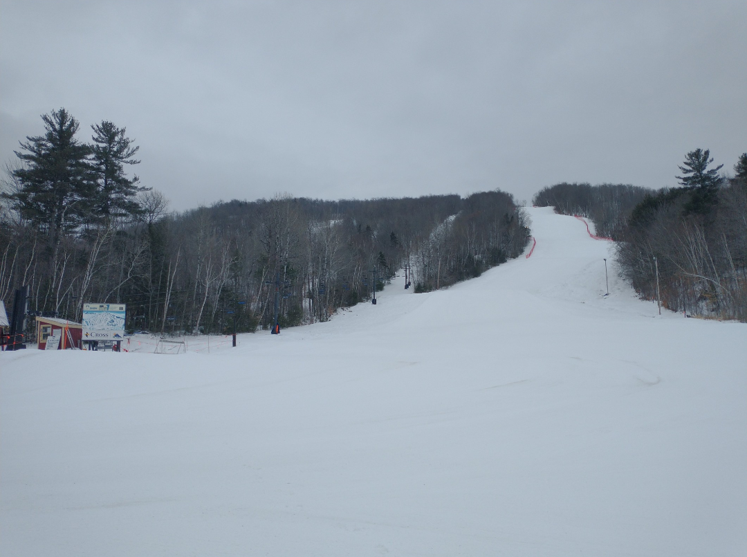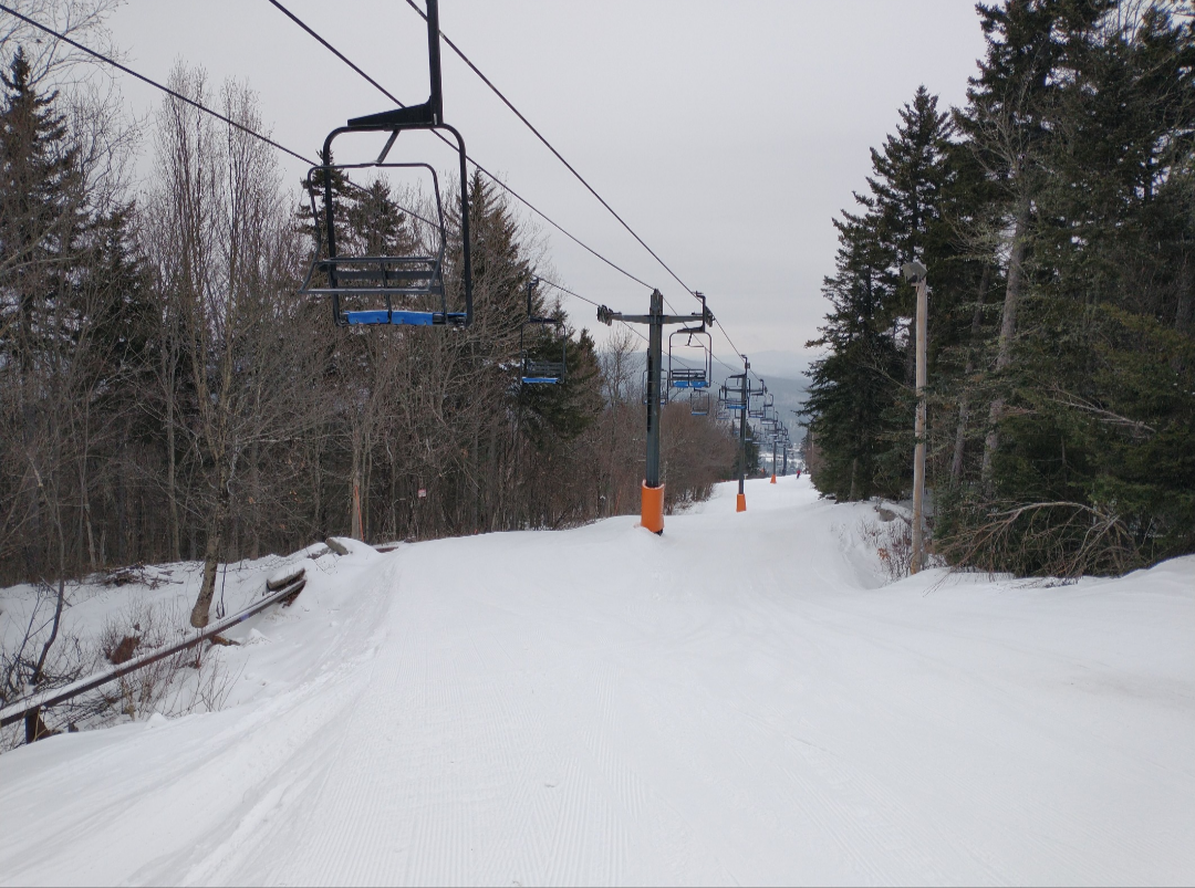 Today was the best day of my season so far! Abram had about half of their terrain open today, much on natural snow. Fearless Leader, Boris, Dudley, Taylor's Treat, Egomaineah, Bullwinkle's Horn, and Mahoosuc Meadow had excellent snow asking coverage and very well groomed packed powder. The many natural snow trails that were open had thin cover in spots and much firmer snow, but they were very skiable. They were running both chairlifts, which were ski-on all day with very light crowds. Thanks to the lack of crowds, and the relatively extensive amount of terrain open, nothing got scraped off at all.