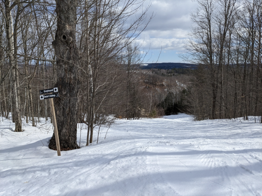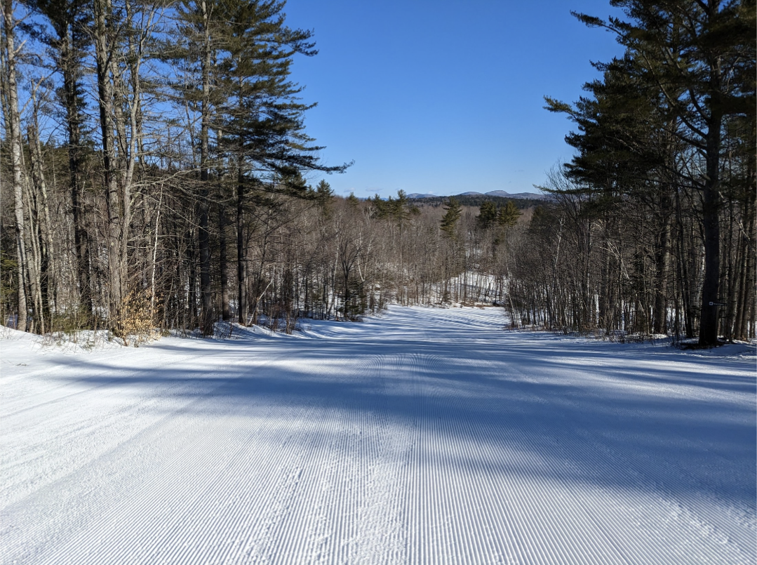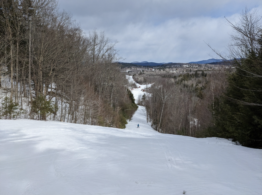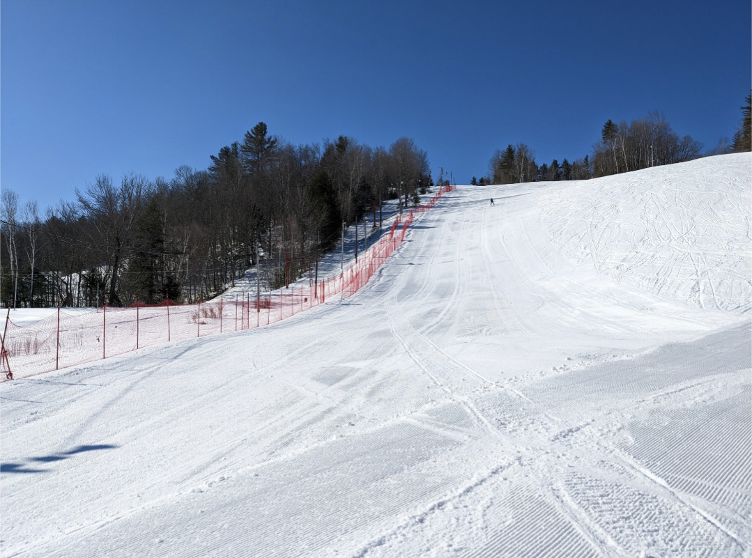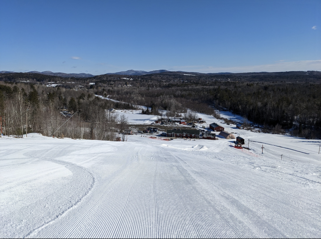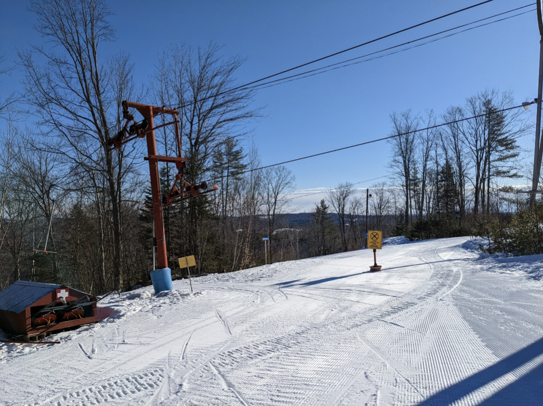 Today was a beautiful bluebird day for the dummy downhill and the last day of regular operations for the season at Titcomb. The mountain will be closed this week, but they plan to reopen next weekend, if the weather cooperates. Conditions were loose granular on groomed trails and frozen granular on ungroomed trails. The skiing on groomed terrain was excellent, with no ice patches to be found. Ungroomed terrain was firm and chattery, and they had Dare Devil's Plunge, Old Jumper, Final Fall, and Dire Straights closed due to the firm conditions. All other trails and glades were open.