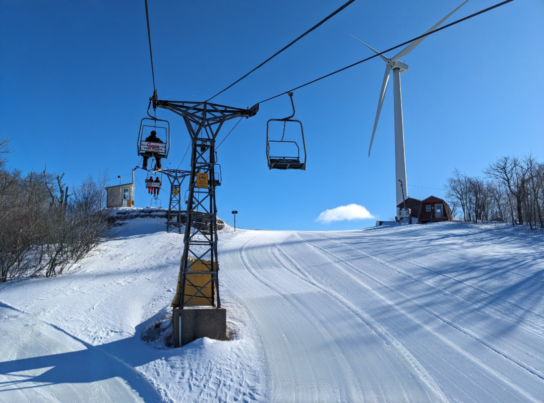 It was a chilly bluebird day at BigRock today. Temperatures were in the single digits and teens for most of the day, but the sun made it manageable. Everything was open, except for North Star and most of the advanced terrain to skier's left. Groomed terrain was excellent packed powder, but ungroomed terrain wasn't as great; there were a couple inches of powder on top of a very firm surface. Natural trails had numerous thin spots, some of which were difficult to see under the new snow. Most glades had enough snow to ski, but they varied in snow quality. Crowds were light, and there weren't lines on either chairlift all day.