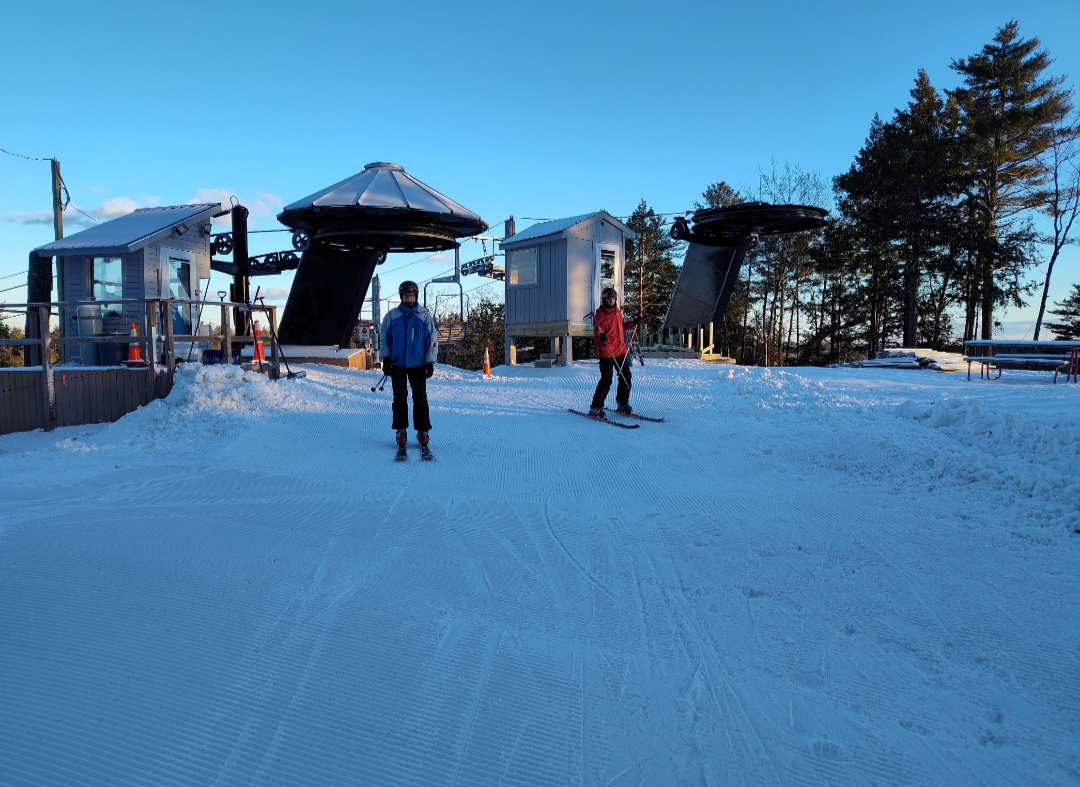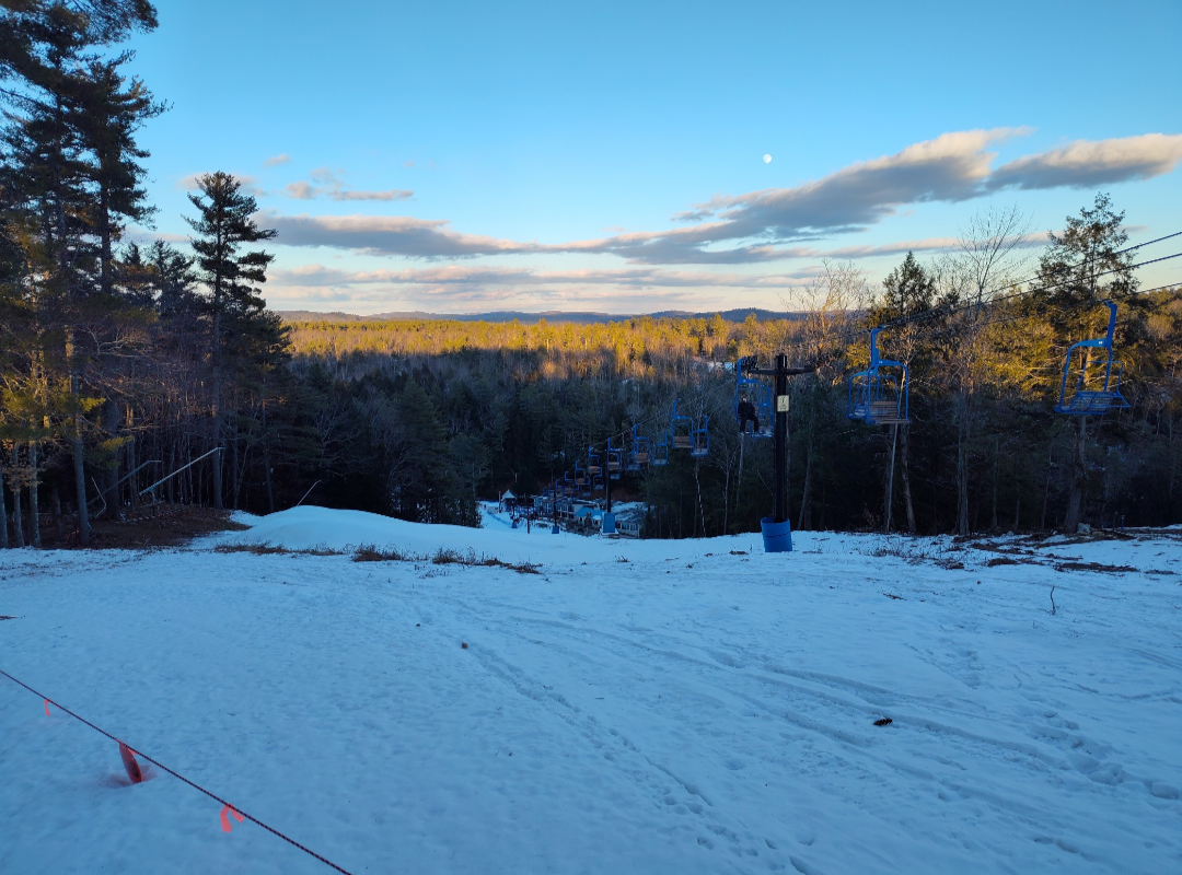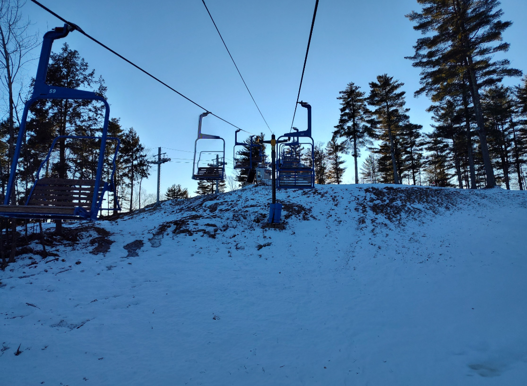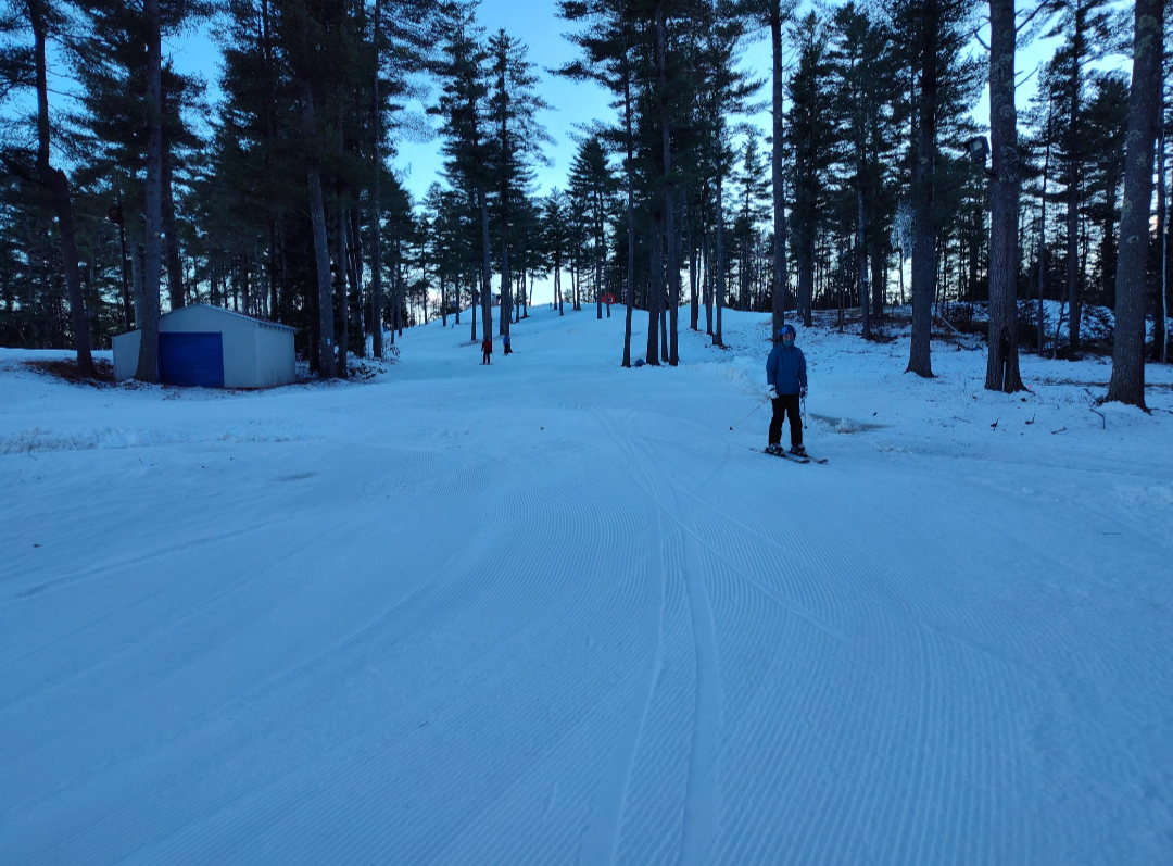 Although they had opened last Sunday for an early "bonus day," Lost Valley still continued their traditional $25 opening day yesterday. Chair 1 was open with two ways down via Deer Run and Big Buck or Pine Grove and Bobcat. All open trails were groomed to some degree, but there were many whales that had yet to be pushed out that were fun to ski on and over. Snow conditions varied depending on how old the snow was, from nice loose granular to a firm frozen granular.