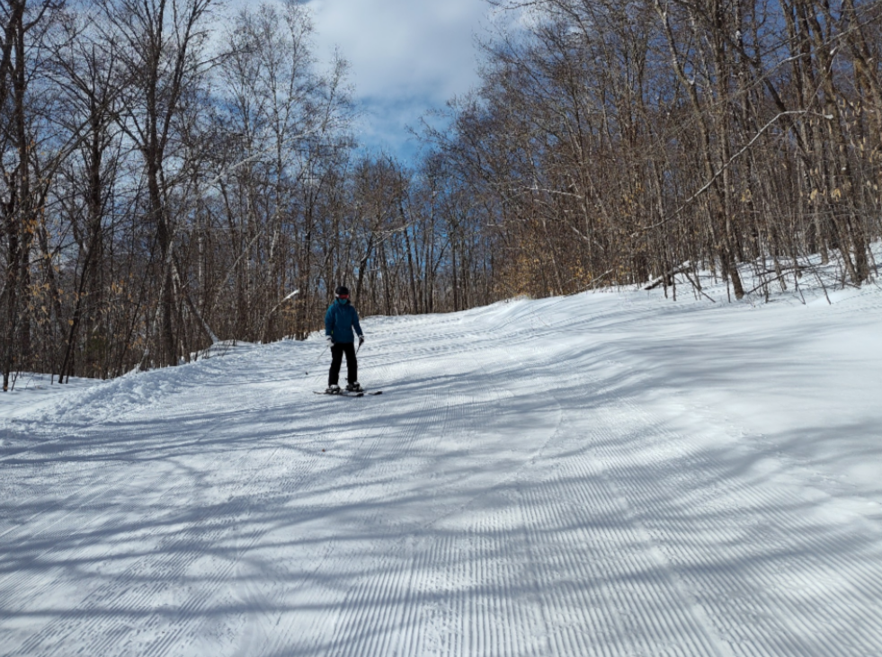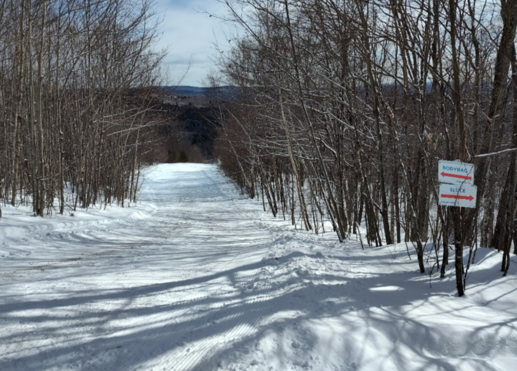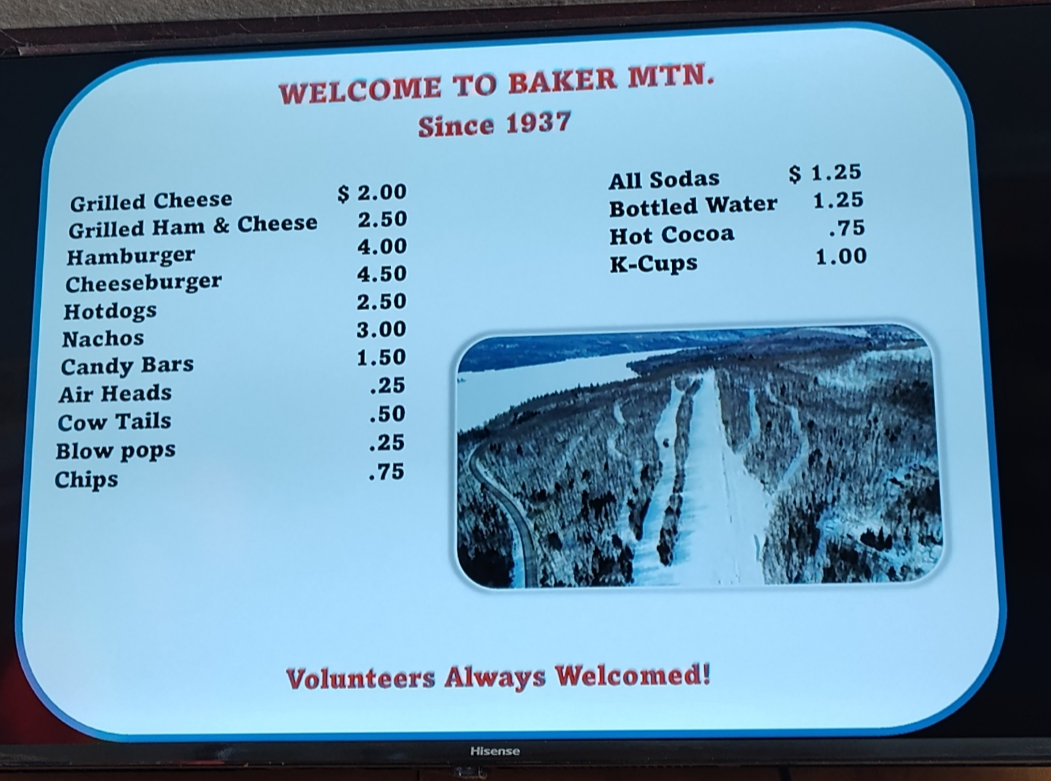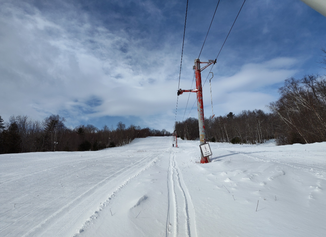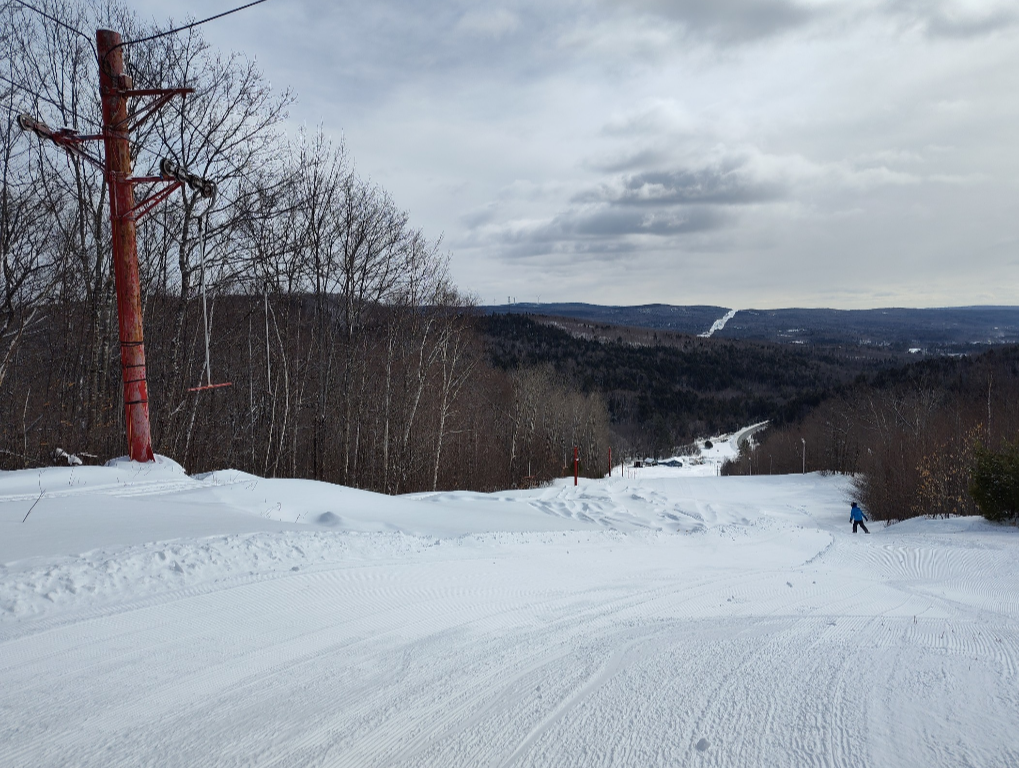 Baker Mountain is the tallest ski area in New England without a chairlift, and they have kept their ticket price at $15 this year, so with over a foot of fresh snow today, it was impossible to go wrong! There was freshly groomed packed powder on many trails, but Upper Bucksaw, Upper Wedge, and skier's left side of Bodybag were left as untouched powder. The mountain was 100% open and it was quite busy today. The majority of tees were going up loaded, but lift lines never got more than a minute or two long, and there was usually no line at all. It was chilly and there was a bit of wind, but the sun was out and it really wasn't bad. It was definitely the best conditions that I've seen yet this year, and we spent the whole day on the slopes enjoying the fresh snow, with only a brief break for lunch. On that note, Baker Mountain is one of the few ski areas that we will still buy lunch at, as their prices are extremely reasonable. It cost us $14 for two cheeseburgers, nachos, a bag of chips, and an iced tea. The great volunteers who keep this place running and allow two people to ski all day and have lunch for a total of under $45 deserve a huge thanks, and Baker is definitely worth a visit!