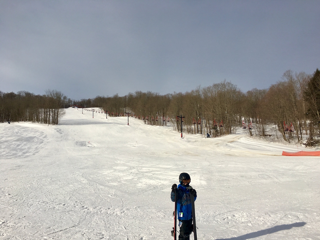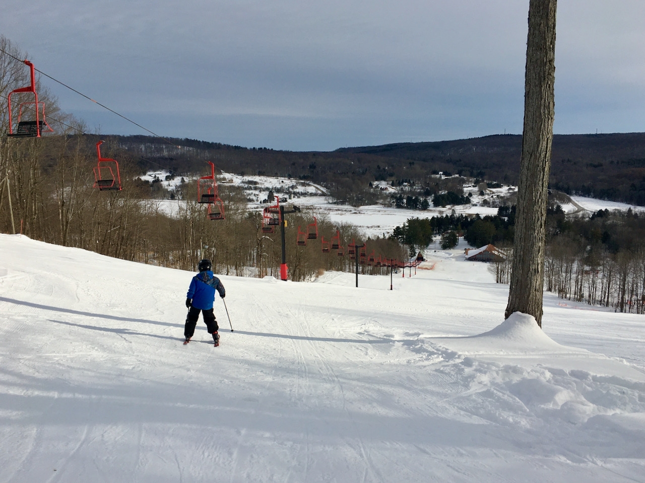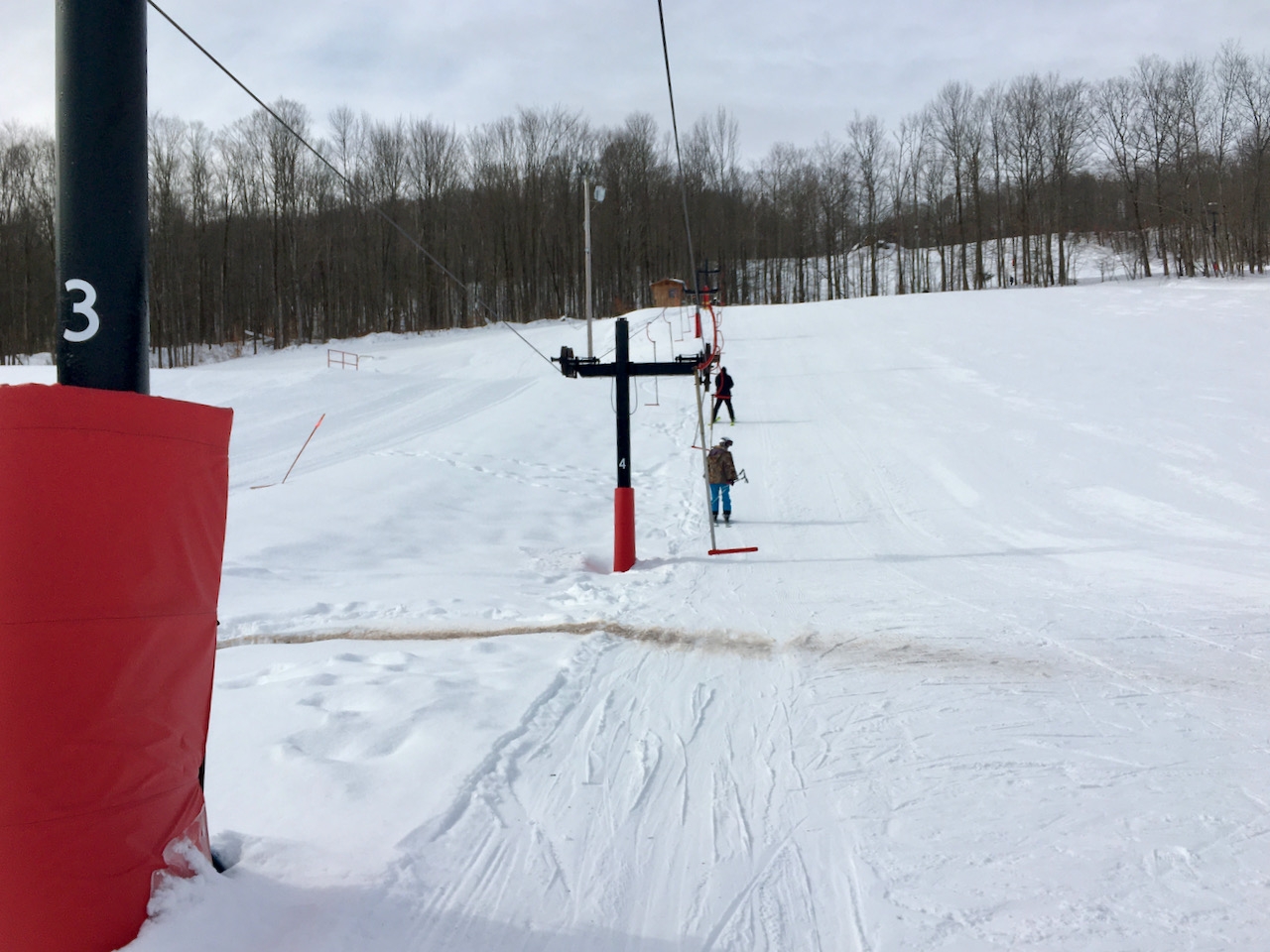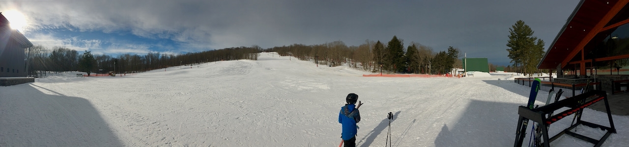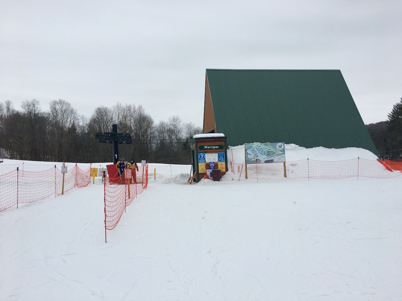 We arrived just after 9am and were the first people in the parking lot though a couple more cars pulled in shortly after we did. I had purchased the tickets on line the night before ($50 weekend adult, $40 junior) so all we had to do was do a quick covid check and redeem our tickets before heading for the lift. We were lucky enough to be the first ones up the hill and for the first hour or so it felt like we had the place to ourselves getting first tracks on several runs. They had not groomed the night before so no photos of fresh tracks on new corduroy but everything felt like it was in good shape. We did our first few runs off the Macaron lift since it was right next to the lodge. This chair was the last of the three lifts to reopen and had just started spinning on Thursday. I found out from the folks in the ticket office as I was checking in that it had needed a new haul rope. This lift serves the two black runs, Macaron and Honey Bun, and offers an alternative to skating to access the blue runs that make up the middle part of the hill.