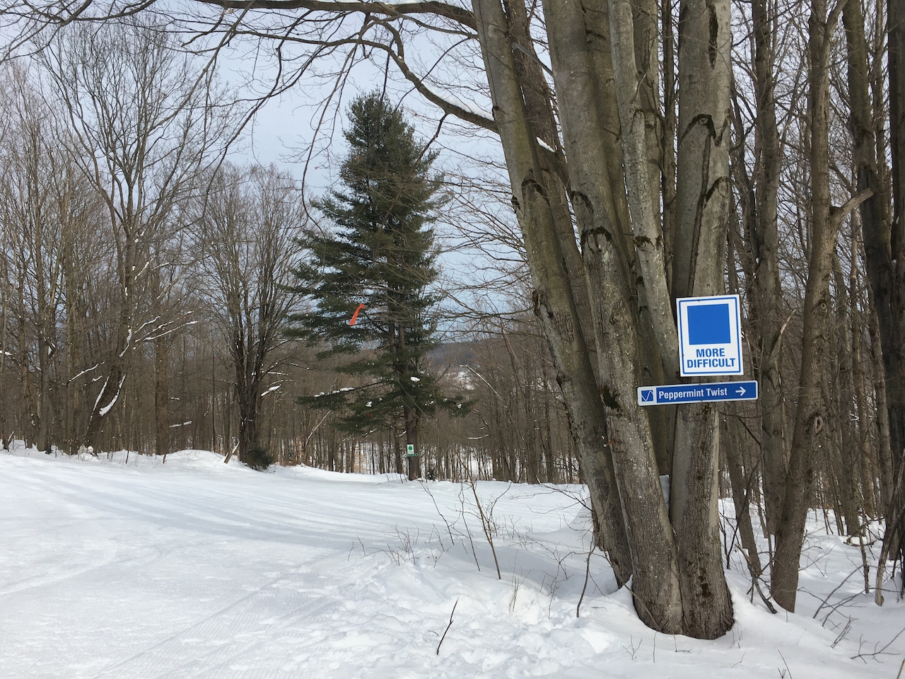 After skiing a few runs we headed over to the Marzipan chair to check out that side and the "timber trails" through the woods. While the main slopes offer nice wide runs the triber trails twist through the woods crossing over each other as they meander down to the base giving the hill that "skis bigger than it is" feeling. The runs on this side were all blue or green.