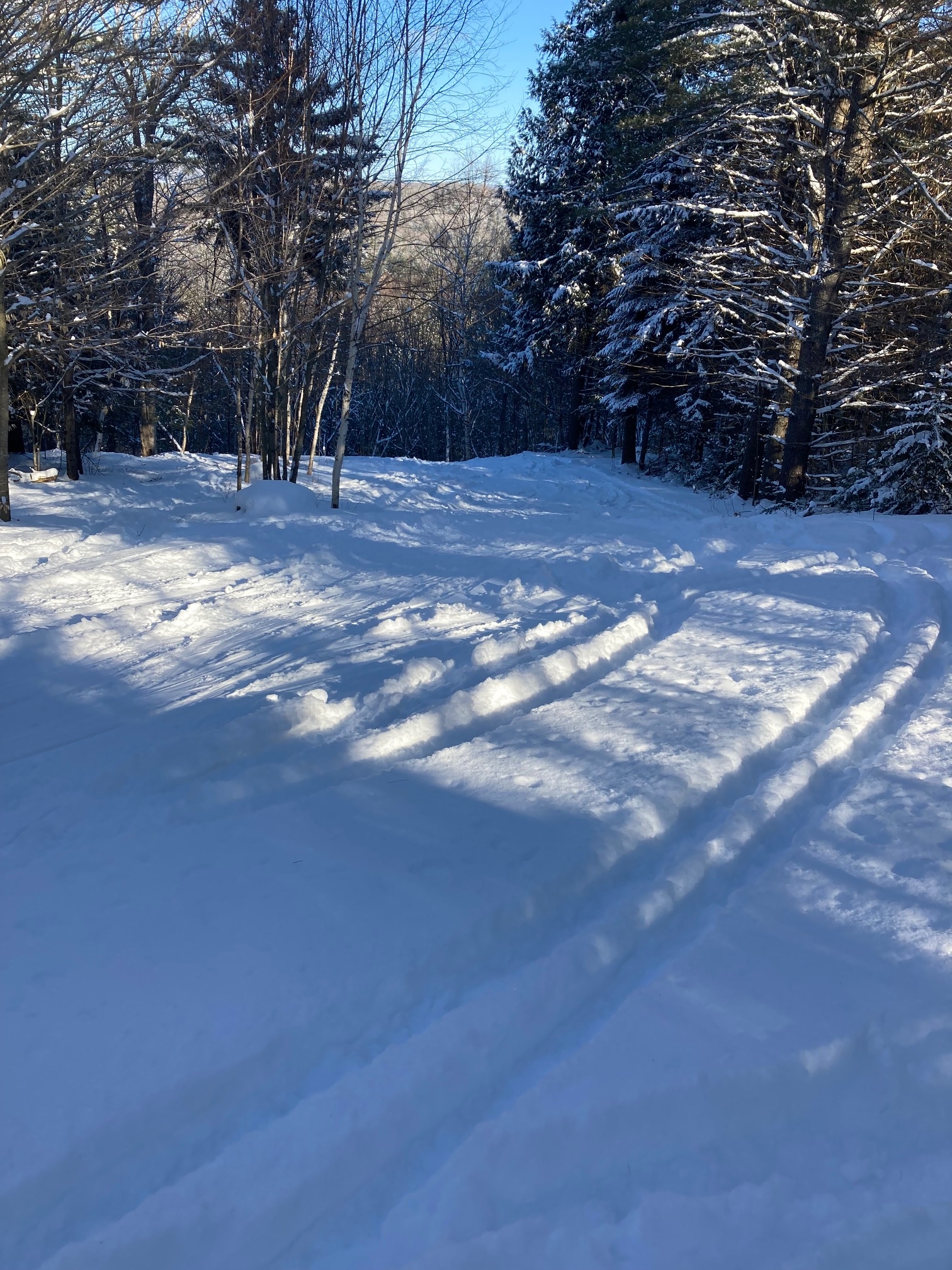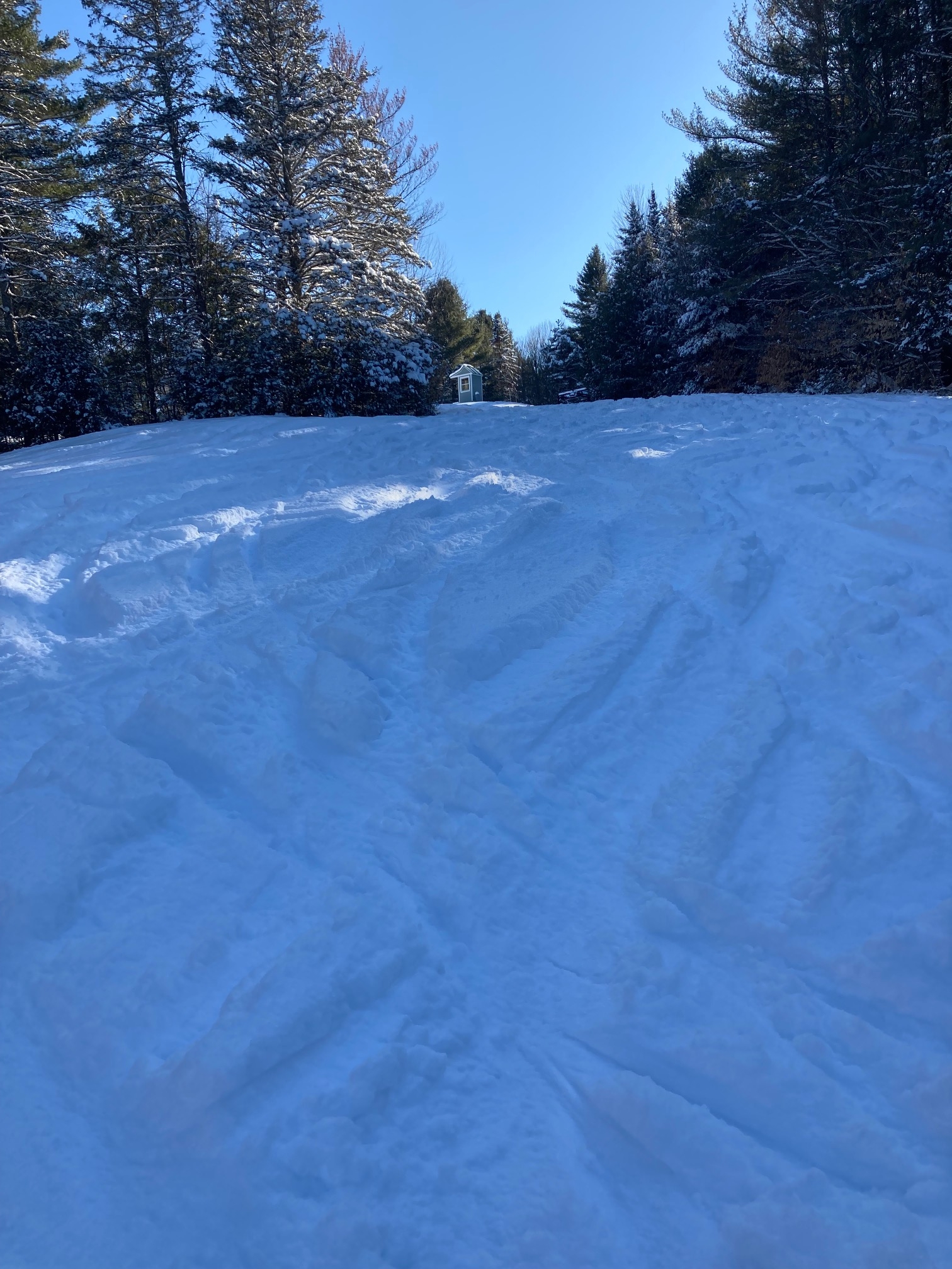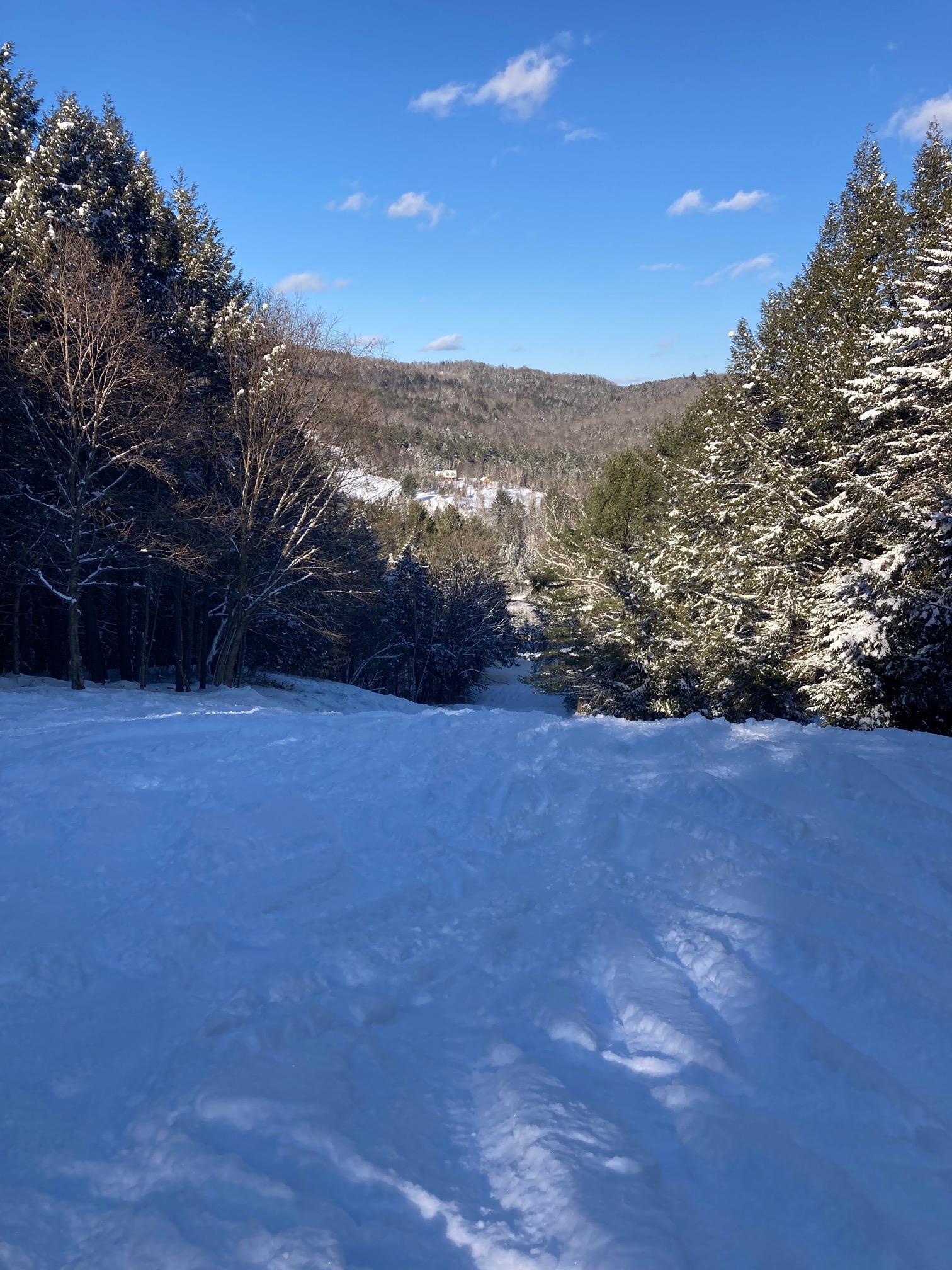 It was really fun, with varied terrain that "skis bigger than 340 vt. ft." Beautiful sunny late Feb. day, about 10 inches of new snow that was packed or skied out (but not entirely, as you'll see below), on top of what I think was a base of ice, groundswell ice, frozen stream(s), frozen sod/ice etc....but I never gashed a ski. If you never get there, I hope this gives you a sense of the experience.